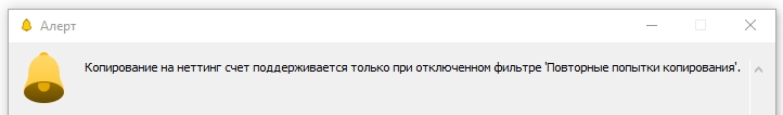 | Вы пытаетесь включить фильтр 'Повторные попытки копирования' на неттинг-счете. Trade Copier не поддерживает работу с включенным фильтром ''Повторные попытки копирования'. если Slave является с неттинг-счетом. |
