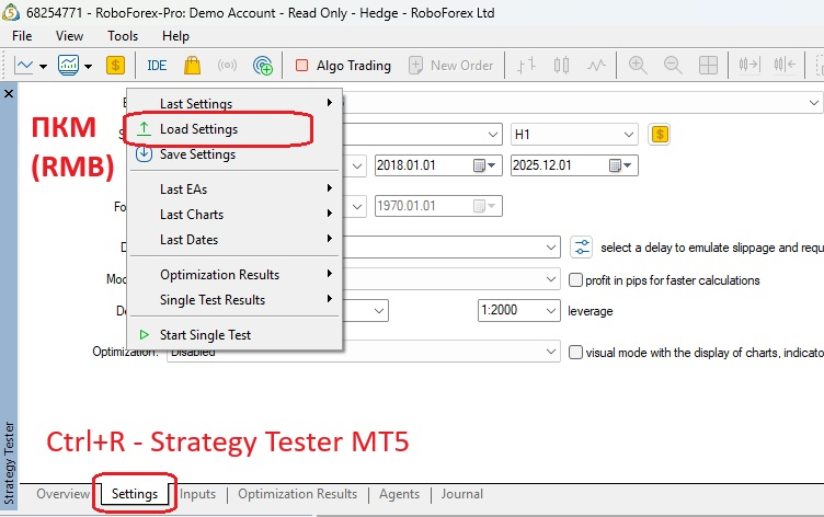 Инвест-пароль: !nvestorPro100 После подключения к счету, необходимо загрузить файл настроек (примеры сетапов, показанные на скринах ниже, соответствуют загружаемым .ini файлам, приложенным к данному посту). Сам робот для целей проведения тестов свободно скачивается (Демо-) на странице продукта. Ограничение коммерческого использования относится только к реальной торговле (включая демо-счета).