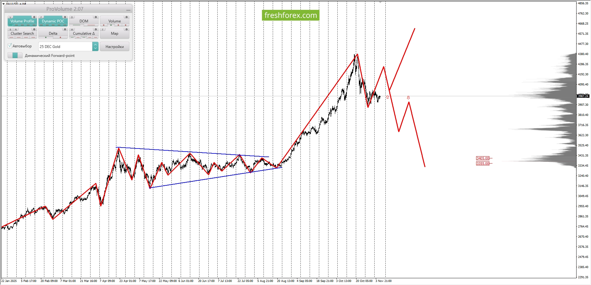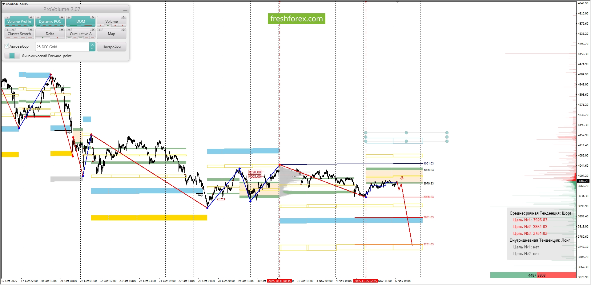 Долгосрочная тенденция: в лонг. Максимальное скопление объемов текущего контракта расположено в диапазоне, по котировкам 3355.00–3405.00. В настоящий момент по XAUUSD совершаются инвестиционные операции выше указанного диапазона, что говорит о силе покупателей.