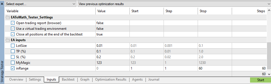- Задать настройки советника (для одиночного прохода или для оптимизации).