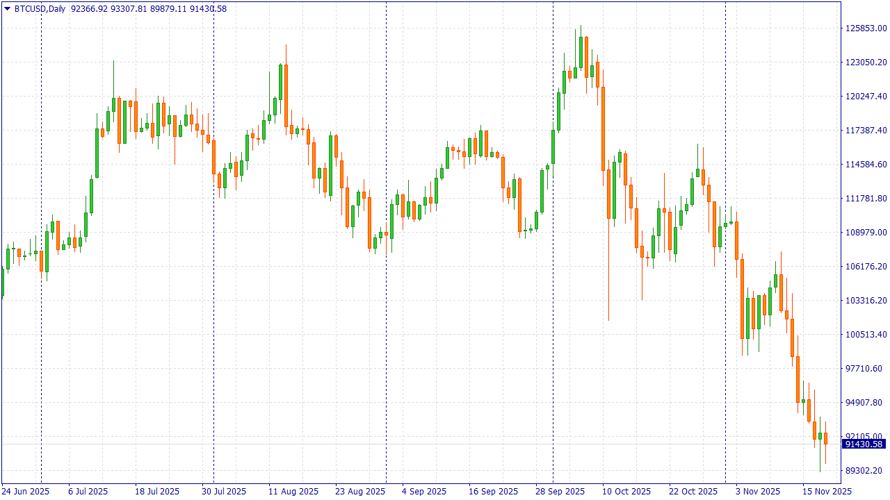 18 ноября BTCUSD упал примерно на 29% - с пика около $126 000 до ~$89 000. Падение биткоина произошло из-за совокупности факторов: после рекорда многие инвесторы зафиксировали прибыль, из биржевых фондов на биткоин (spot-ETF) пошли деньги на выход, на мировых рынках началась осторожность — просели тех-акции и AI-компании. Резкие колебания цены вызвали принудительные закрытия «плечевых» сделок, что усилило падение, а альткоины падали ещё быстрее и вытягивали ликвидность с рынка — из-за этого продавцов стало больше, чем покупателей, и цена просела сильнее.