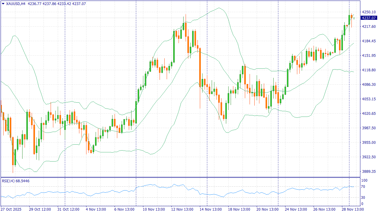 К началу недели спот-котировки удерживаются выше $4 200 за унцию, а новостной фон остаётся благоприятным: рынок оценивает высокую вероятность декабрьского снижения ставки и реагирует на колебания доллара. В краткосрочном горизонте баланс факторов остаётся конструктивным: сочетание мягких ожиданий по политике ФРС, слабого доллара и геополитической неопределённости поддерживает спрос на золото, позволяя целиться в зону дальнейшего роста при умеренных откатах.