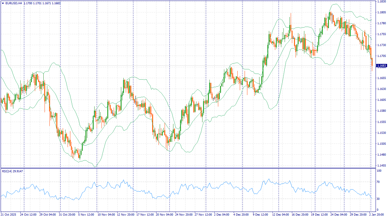 EUR/USD в понедельник, 5 января, держится около 1,1680–1,1700. Доллар укрепляется в начале первой полной недели 2026 года, так как инвесторы переключились на свежую статистику США и снизили готовность к риску. На настроения также влияет рост геополитической неопределённости: при любом всплеске новостей спрос на защитные активы обычно поддерживает американскую валюту.
