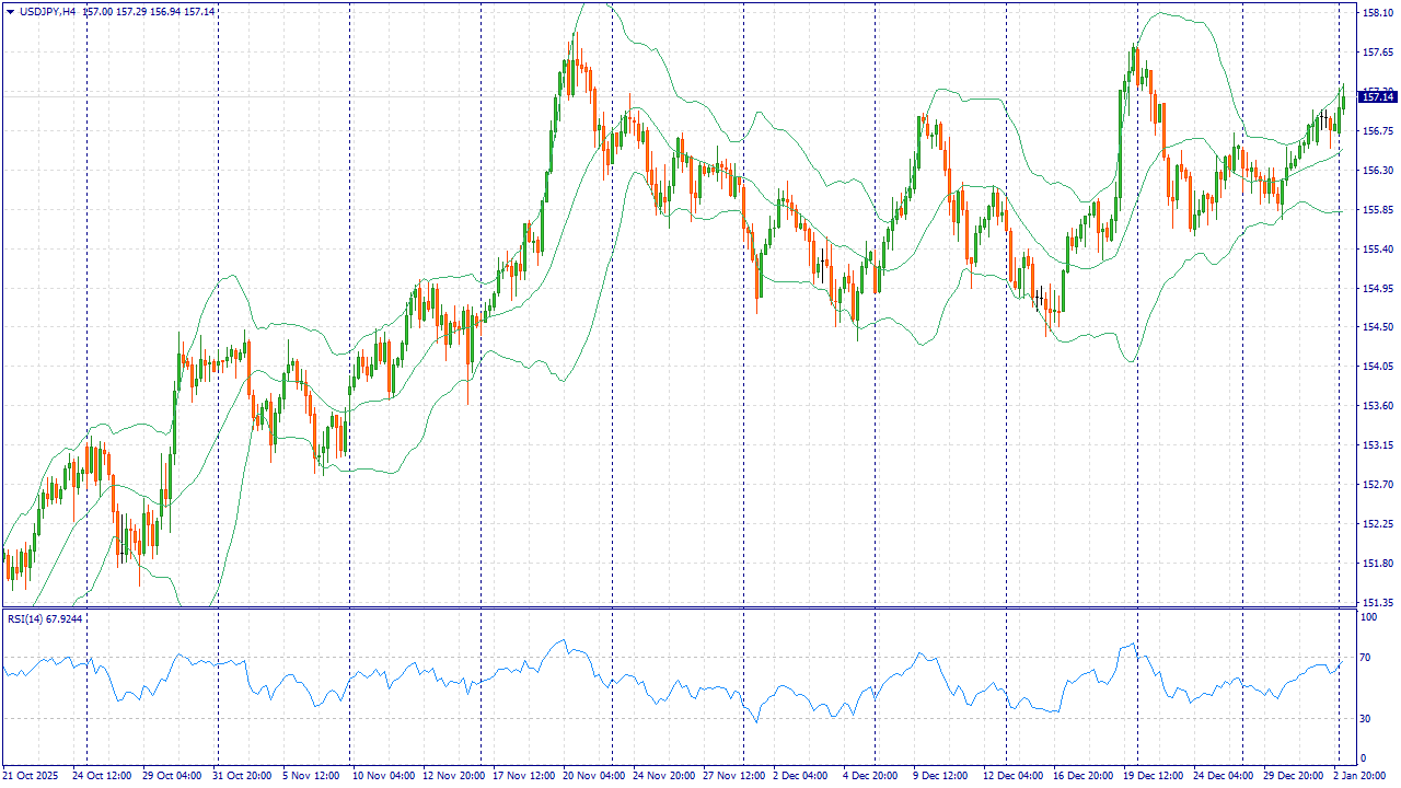 USD/JPY в понедельник, 5 января, торгуется около 157,0–157,3. Доллар получает поддержку на старте первой полной недели 2026 года на фоне ожиданий насыщенного календаря статистики США. При спокойном спросе на риск в глобальных активах сохраняется интерес к операциям, где иена используется как валюта фондирования, что ослабляет её курс.
