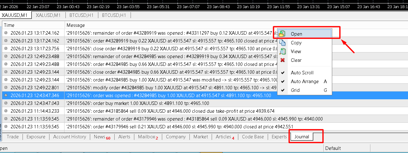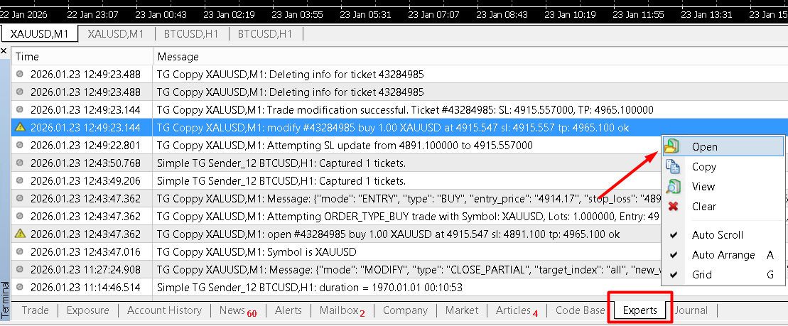Важно: в разделе «Эксперты» отображаются сообщения о продуктах, а в разделе «Журнал» — события терминальной системы и ответы торгового сервера. Как правило, для диагностики необходимы оба раздела .