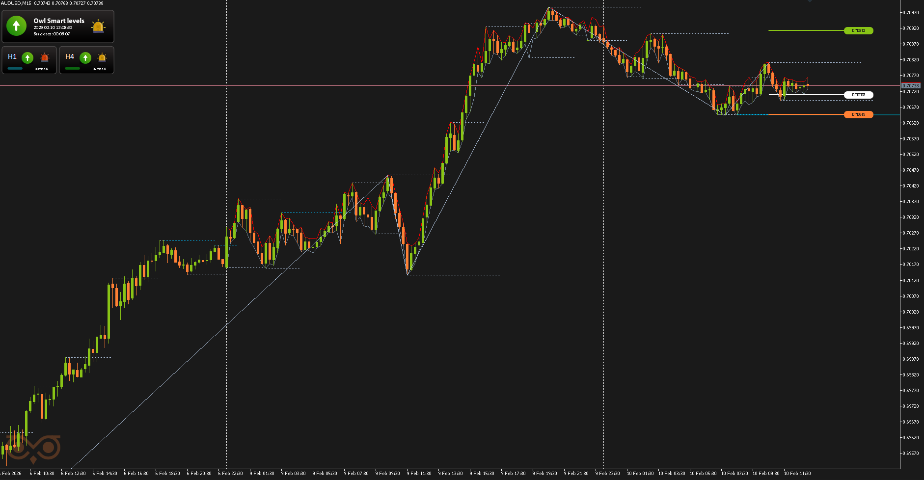 Первая Сделка по валютной паре AUDUSD была открыта по сигналу Owl Smart Levels 10 февраля 2026 года. На момент формирования сигнала система показывала восходящее направление на старших таймфреймах, поэтому вход выполнялся в покупку от заранее размеченного уровня.