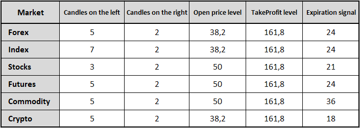 - Expiration signal - количество свечей, в течение которых действует сигнал;