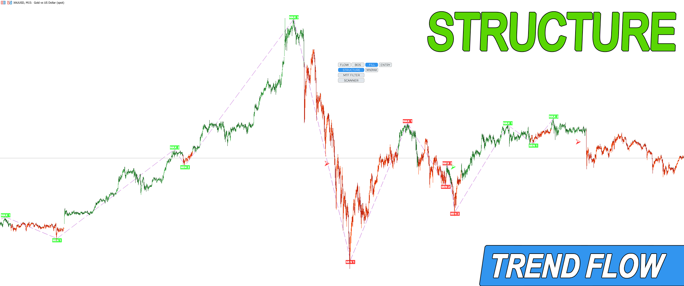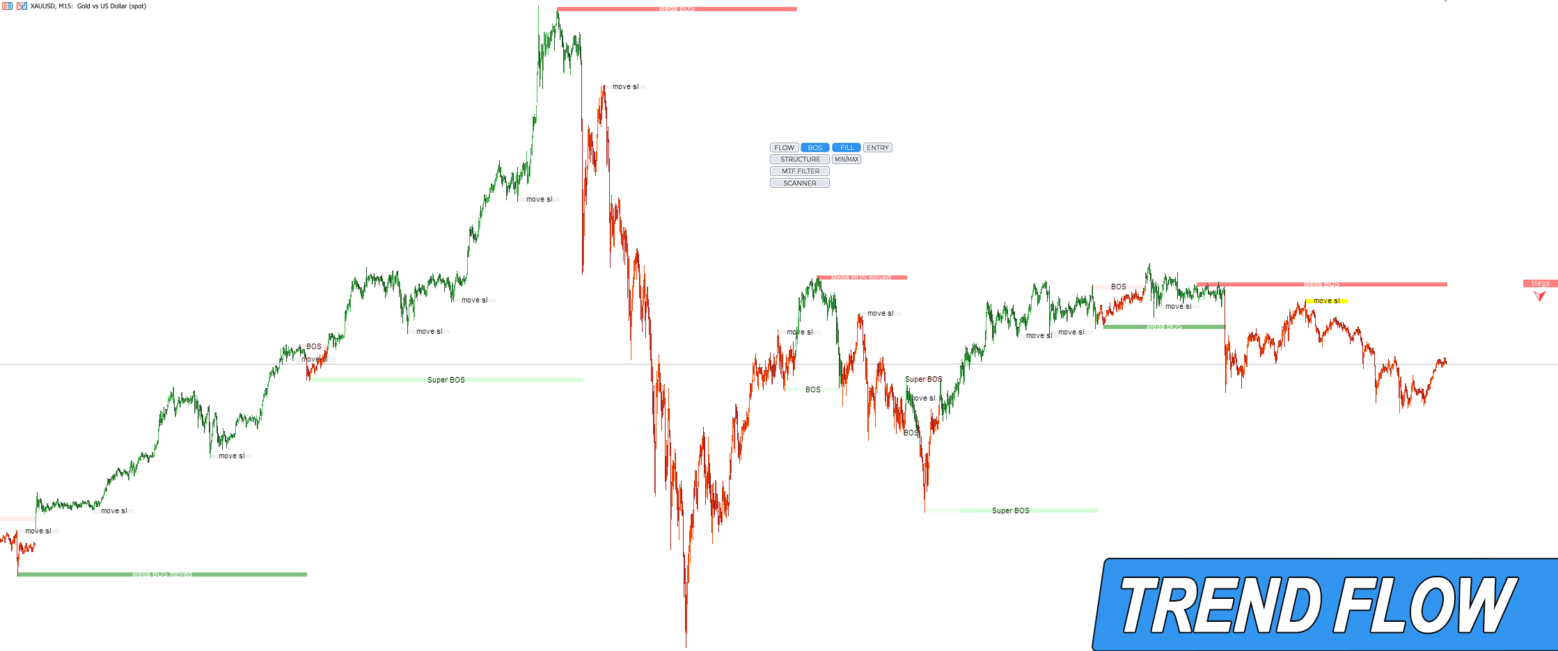 The Trend Flow line acts as a dynamic support or resistance level. It is drawn with a slight offset so as not to distract, while still reminding you of the current trend direction.