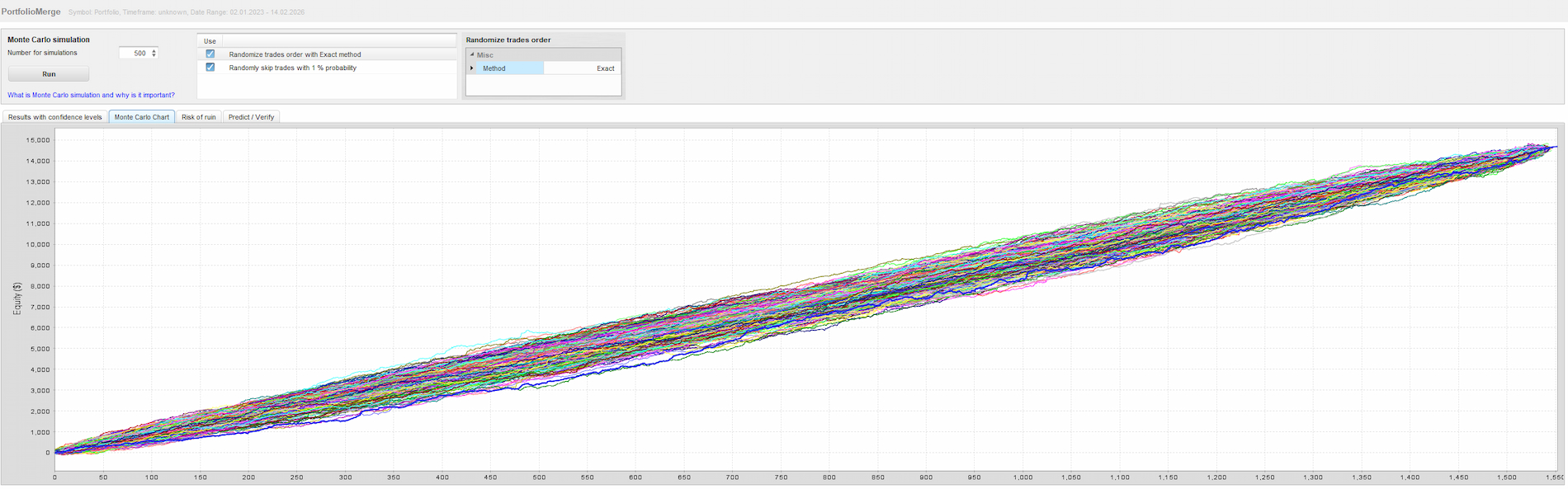The portfolio passed a full stress test: 500 independent scenarios with randomised trade order, spread variation and slippage. Result — all 500 paths show sustained equity growth. Not a single scenario with complete capital loss. This is not just a backtest — it is proof of the system's resilience to randomness and market noise.