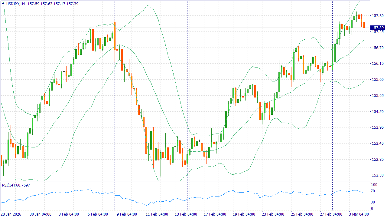 USD/JPY 4 марта удерживается около 157,25 на фоне укрепления доллара и напряженности на энергетическом рынке. Несмотря на общий спрос на защитные активы, иена получает меньше поддержки: Япония — крупный импортер топлива, и скачок нефти ухудшает условия торговли и усиливает инфляционное давление через импорт.