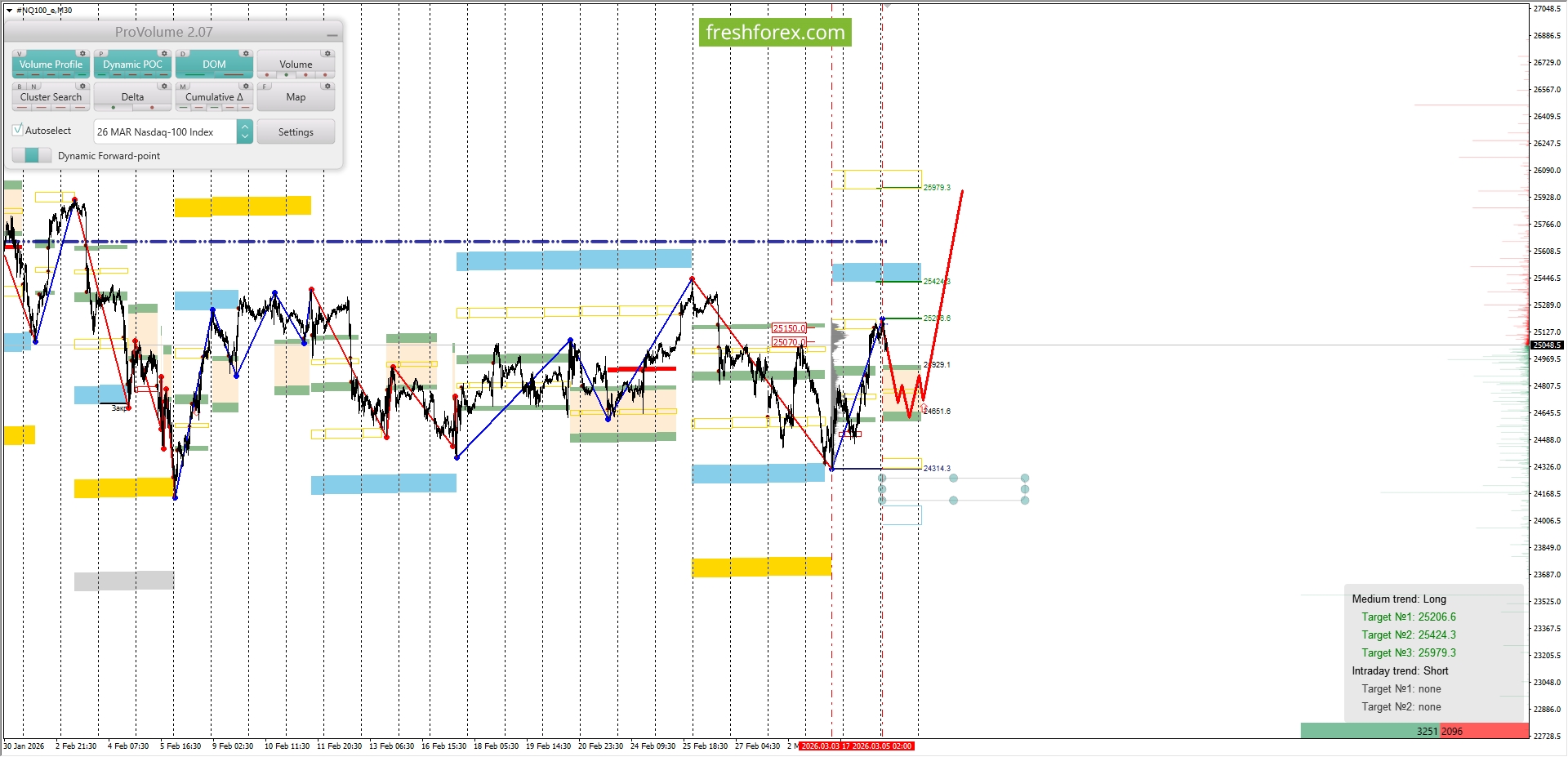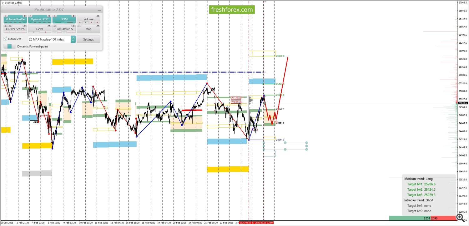 Среднесрочная тенденция: в лонг. Максимальное скопление объемов среднесрочной тенденции расположено в диапазоне, по котировкам 25070.0–25150.0. В настоящий момент по #NQ100 совершаются инвестиционные операции ниже указанного диапазона, что говорит о слабости покупателей.