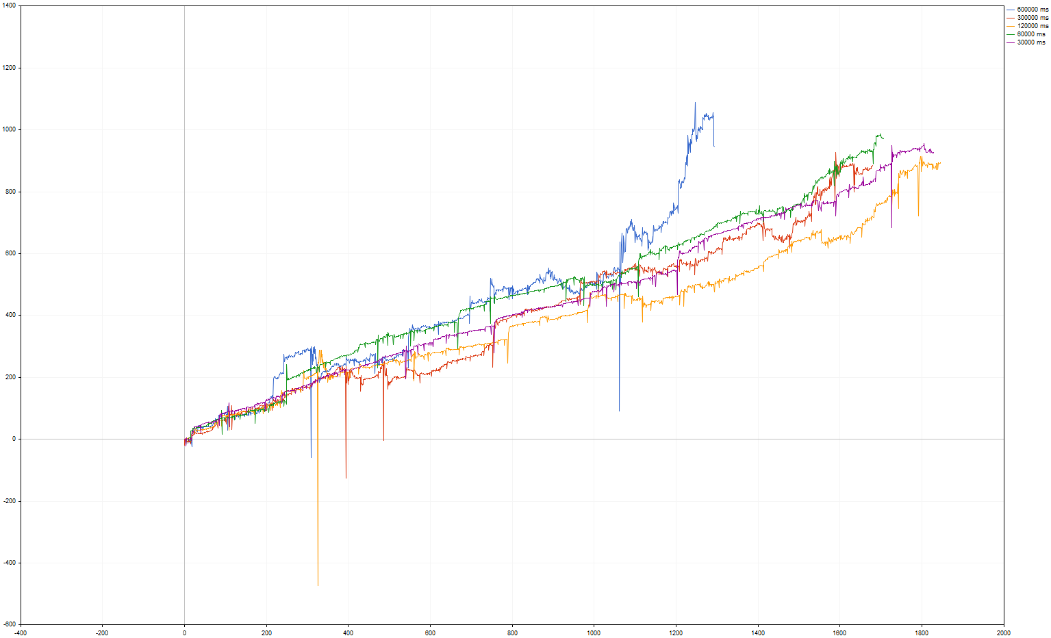 На графике следующие лаги: полминуты, одна, две, пять и десять минут.