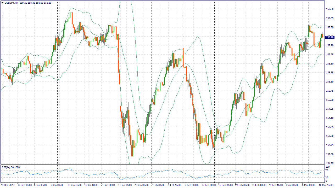 USD/JPY в среду колеблется возле 158,25 после роста, который подпитывали спрос на доллар и повышение цен на энергоносители. Для Японии дорогая нефть — негативный фактор, но в периоды повышенной неопределённости и резких движений на рынках йена часто получает поддержку как защитная валюта, особенно если инвесторы сокращают операции с заёмным финансированием и фиксируют прибыль по долларовым позициям.