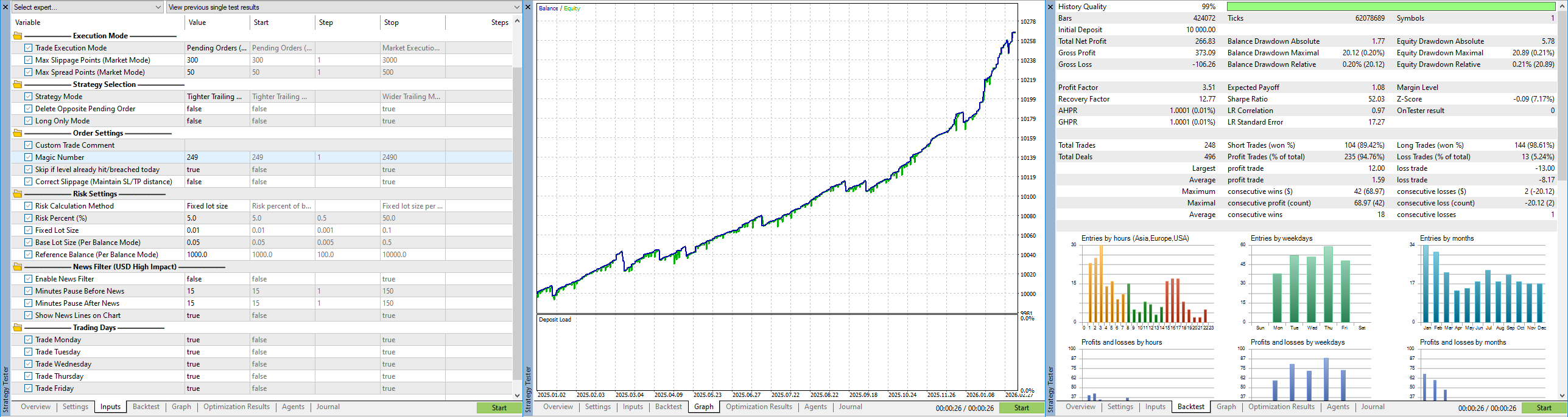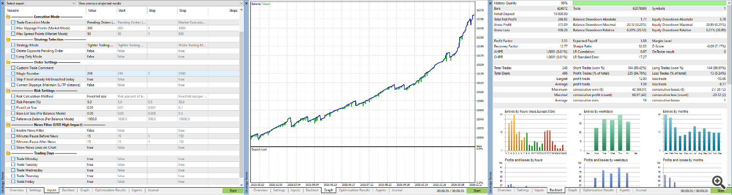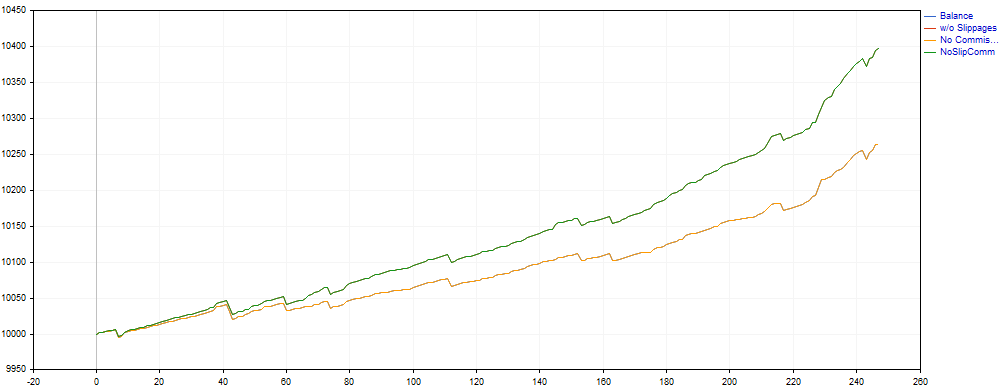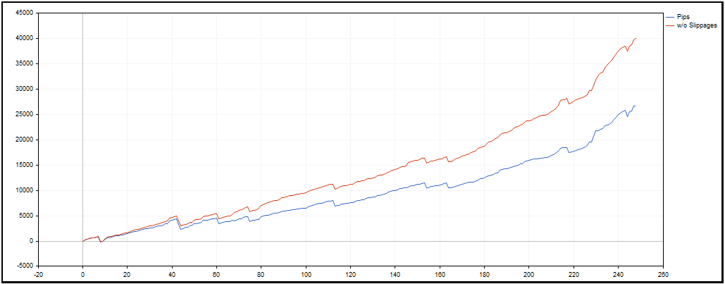 В рынке не более одной открытой позиции, которая открывается заранее выставленной стоповой отложкой. Закрытие почти всегда происходит тоже по стоповому правилу. Поэтому фактор отрицательных скольжений довольно серьезный. Отсюда необходимость для бэктестов ипользовать только реальную тиковую историю, как в бэктестах выше.