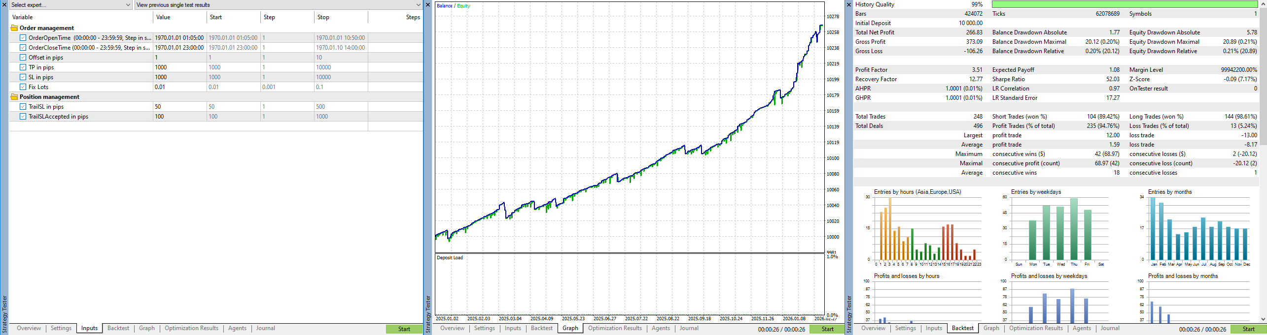 EAToMath.mqh version 2026.03.16 CPU: Intel Core i7-2700K @ 3.50GHz, AVX OS: Windows 10 build 19042 Compiler: 5686 AVX Release AgentBuild: 5686 [2026.03.16 15:37:26.183] EAToMath.mqh 1382: XAUUSD: 2025.01.01 - 2026.03.15, 1 Year 2 Months 14 Days, 62 078 689 ticks. [2026.03.16 15:37:26.183] EAToMath.mqh 1387: TotalTime = 00:00:02.930, Performance = 21.19 Ticks (millions)/sec. [2026.03.16 15:37:26.183] EAToMath.mqh 1547: Virtuals: VIRTUAL::Total() = 1 VIRTUAL::GetHandle() = 1 VIRTUAL::GetID() = EAToMath.mqh OnTester result 10264.68 0 : mathematical test passed in 0:00:03.056 26 Mb memory used