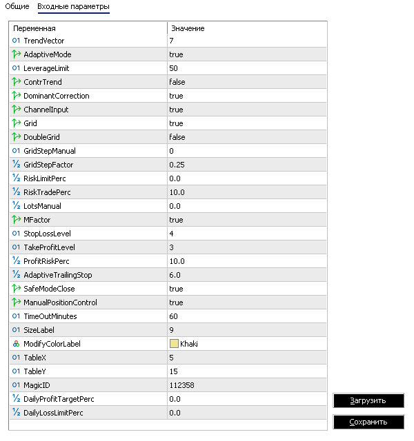 Полная таблица настройки со всеми торговыми и сервисными функциями и типовыми значениями параметров имеет вид: