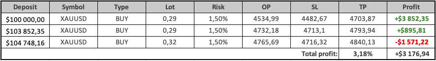 За рассматриваемый период по XAUUSD было получено 3 сигнала. Все 3 сигнала относились к категории высоковероятных, поэтому были взяты в работу. Из 3 открытых сделок 2 сделки были закрыты с прибылью: обе позиции не дошли до TakeProfit, но были закрыты вручную по правилу завершения торгового дня с сохранением положительного результата. Еще 1 сделка завершилась по StopLoss.