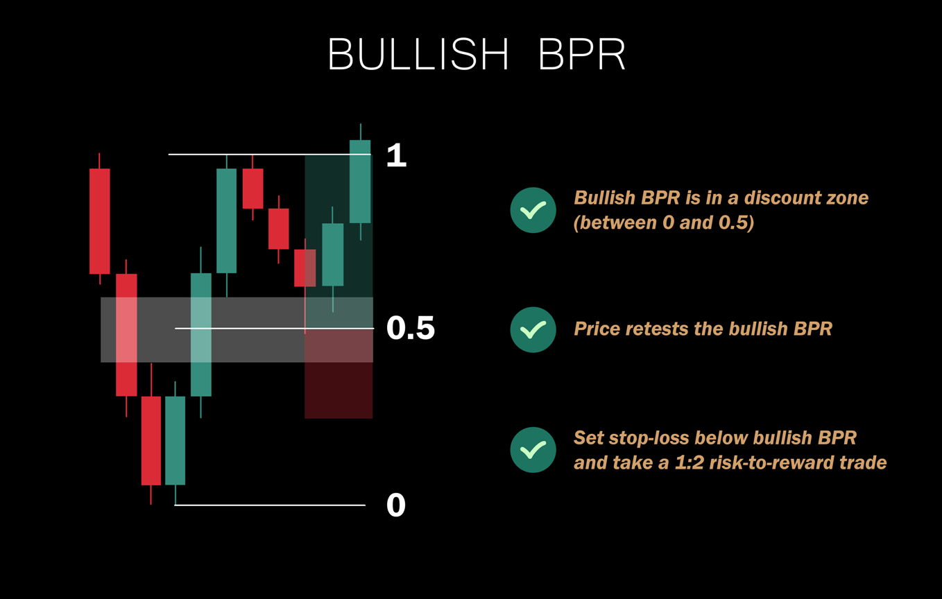 Important: If BPR forms above the 0.5 level (in Premium Zone) — don't trade the buy. Wait for Bearish BPR for a sell.