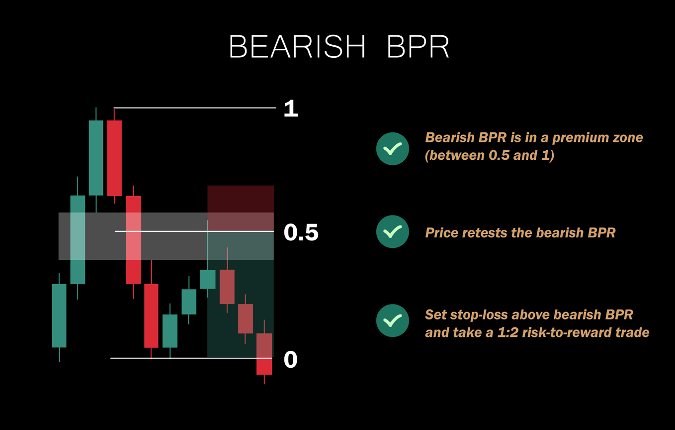 Important: If BPR forms below the 0.5 level (in Discount Zone) — don't trade the sell. Wait for Bullish BPR for a buy.