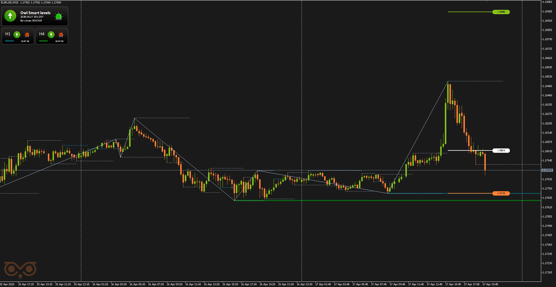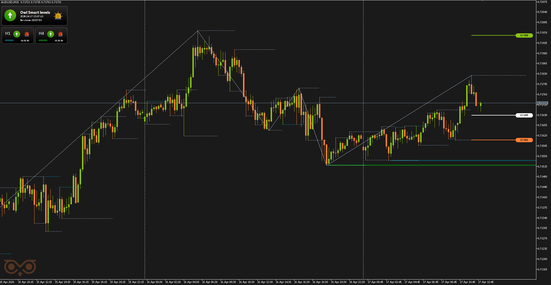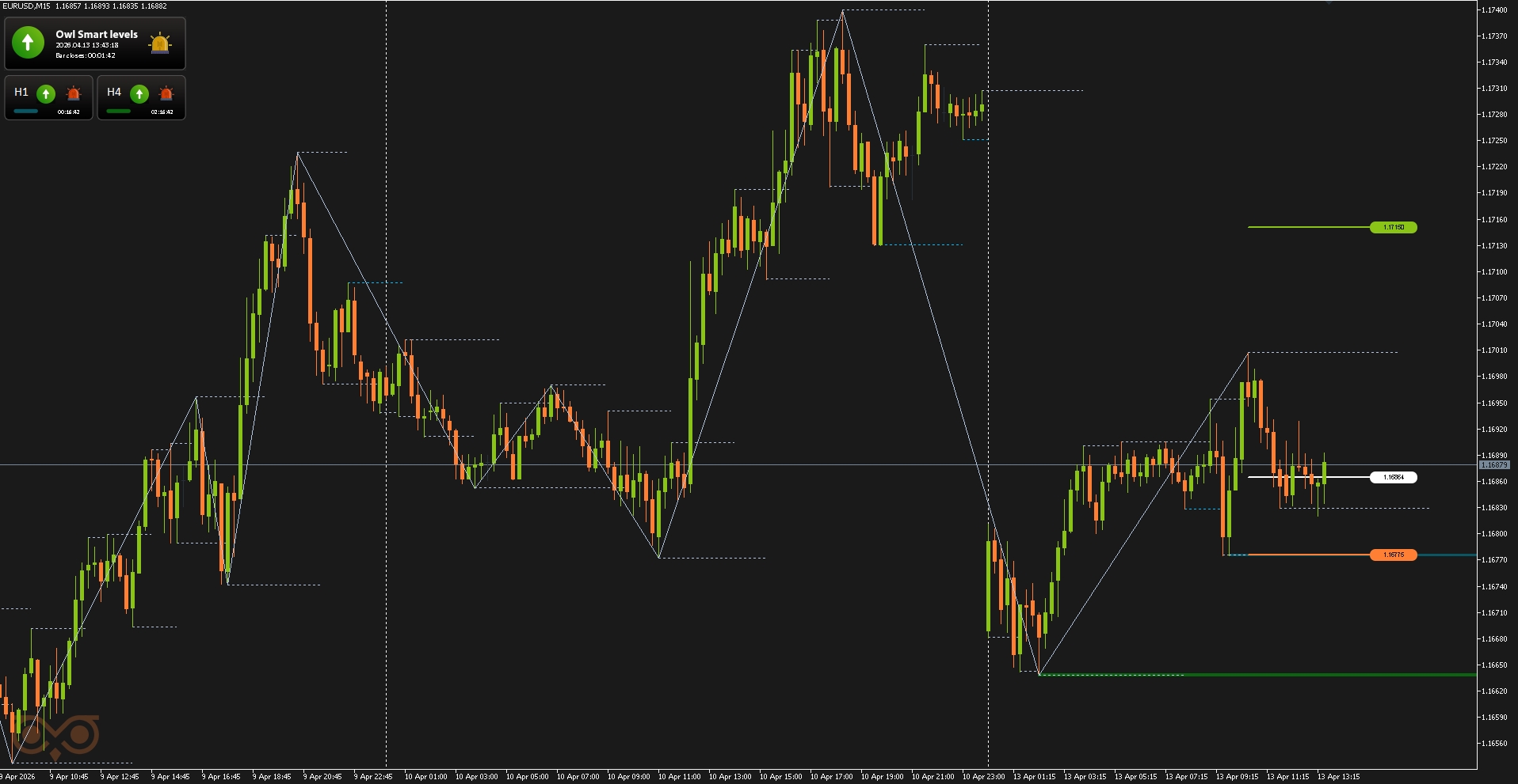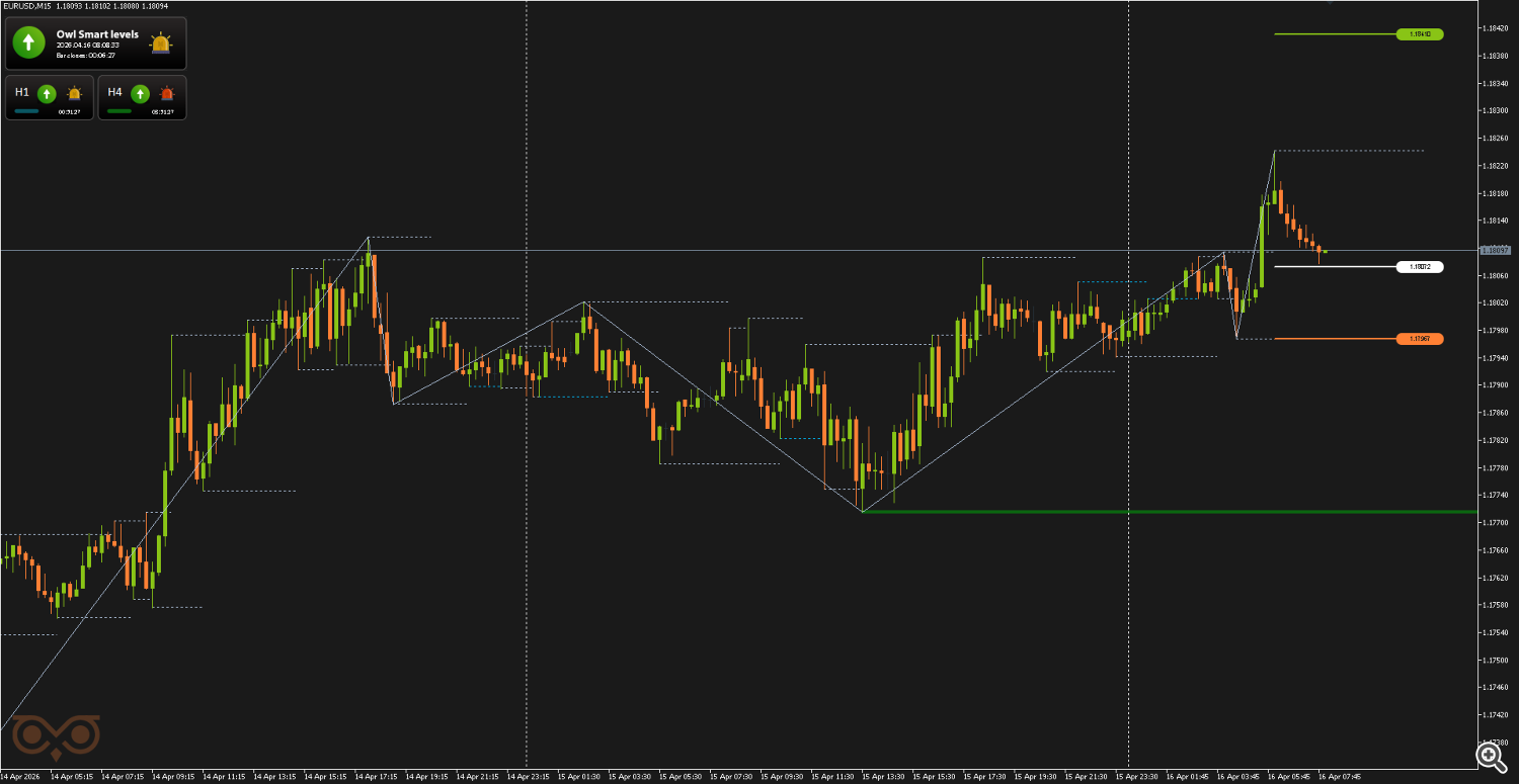 Сегодня я представлю вам обзор сделок, совершенных с использованием торговой системы Owl — умные уровни для валютных пар EURUSD, GBPUSD и AUDUSD за неделю с 13 по 17 апреля 2026 года. В отчёте разобраны все сделки, сформированные по сигналам системы, с учетом строгого риск-менеджмента и заранее определённых уровней входа и выхода из позиции.