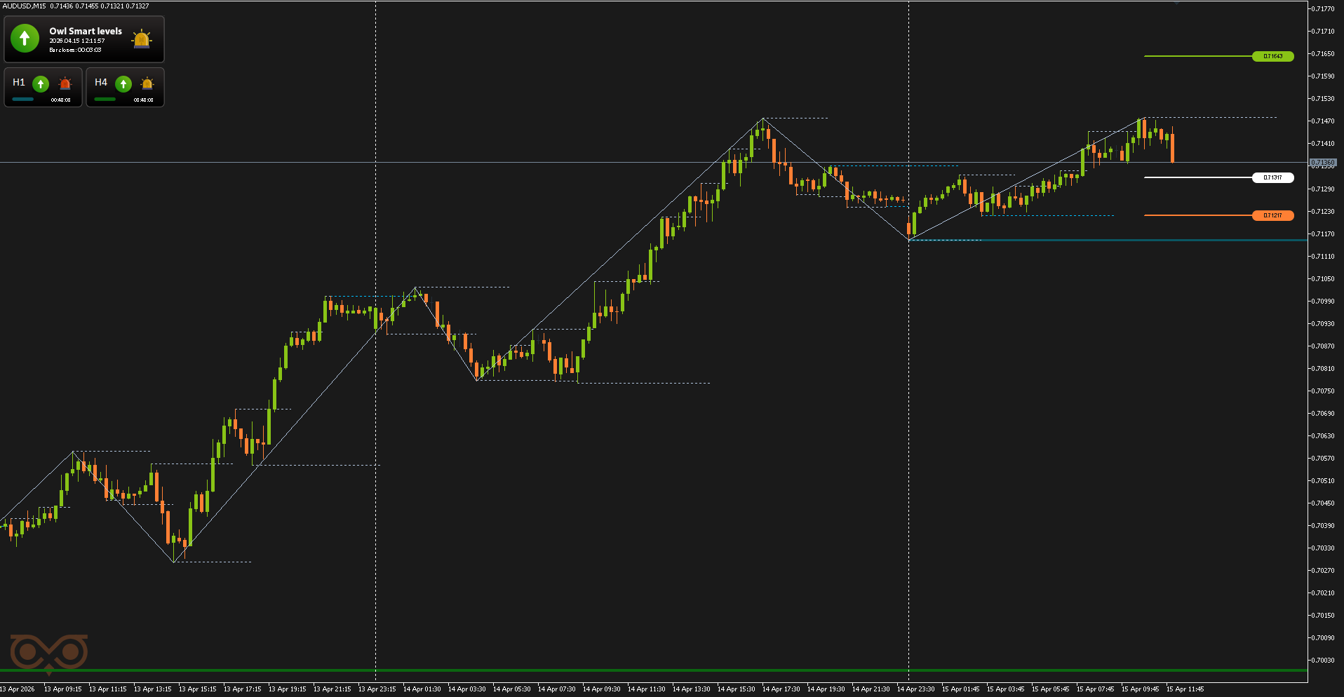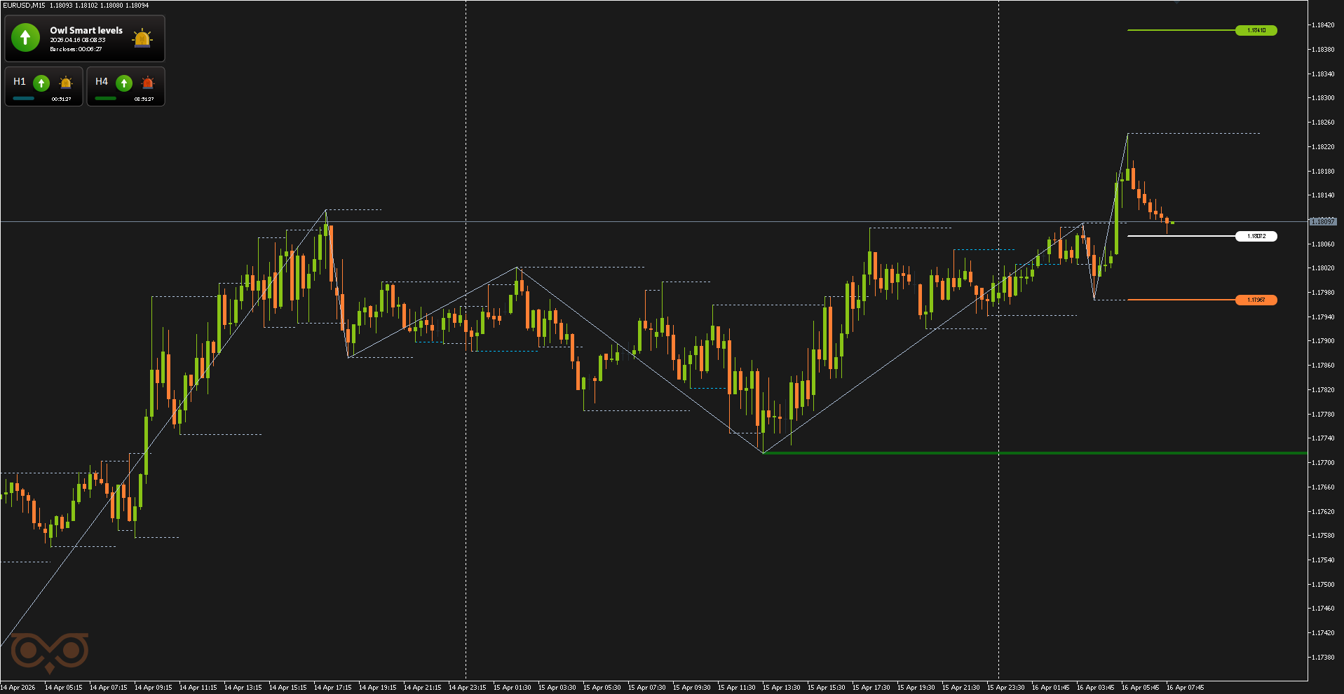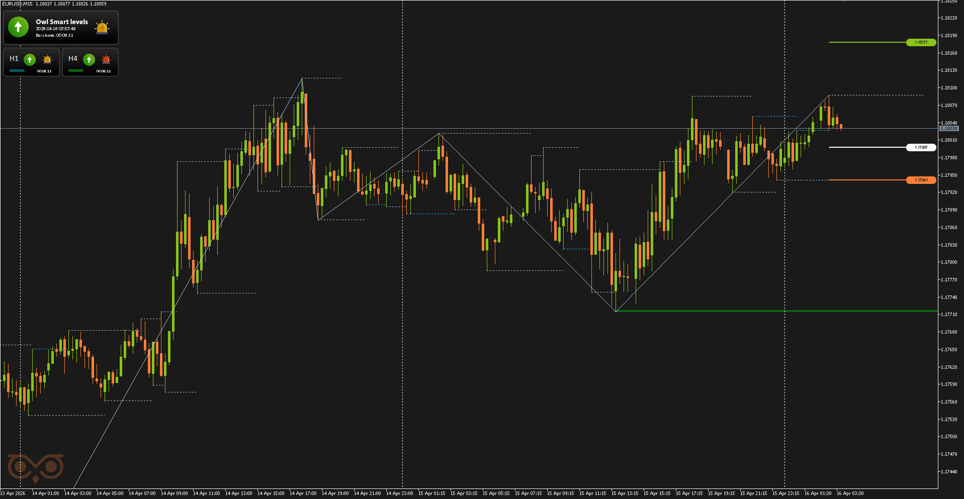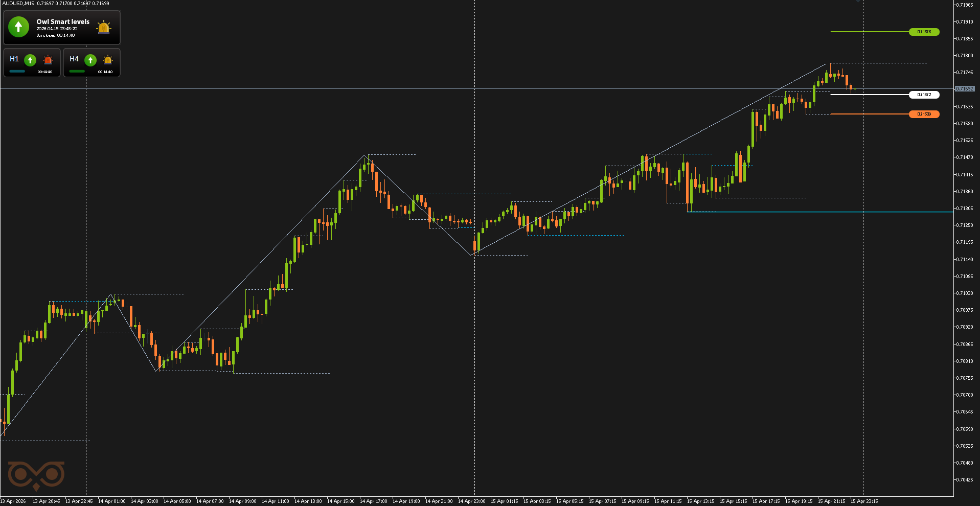 Сегодня я представлю вам обзор сделок, совершенных с использованием торговой системы Owl — умные уровни для валютных пар EURUSD, GBPUSD и AUDUSD за неделю с 13 по 17 апреля 2026 года. В отчёте разобраны все сделки, сформированные по сигналам системы, с учетом строгого риск-менеджмента и заранее определённых уровней входа и выхода из позиции.