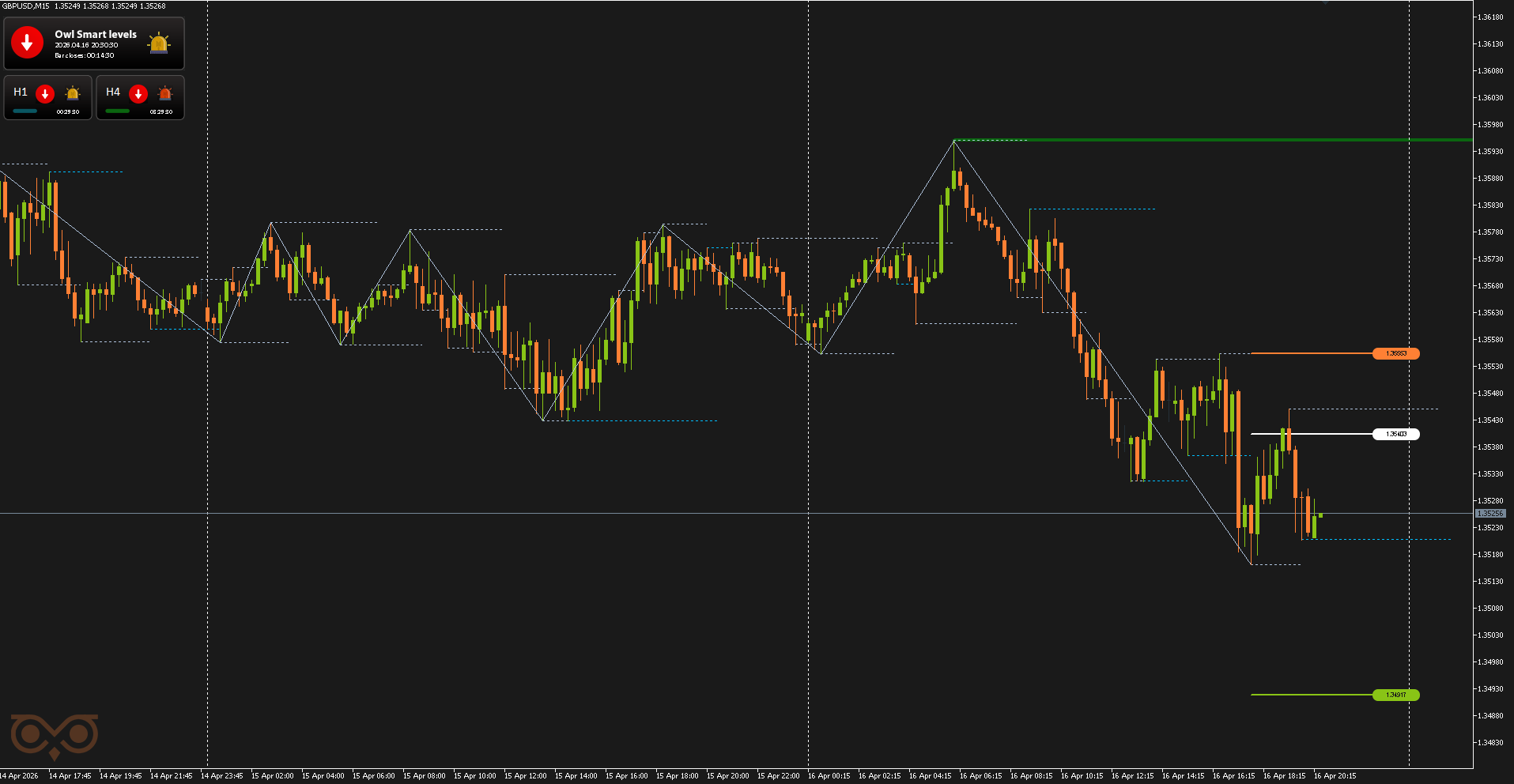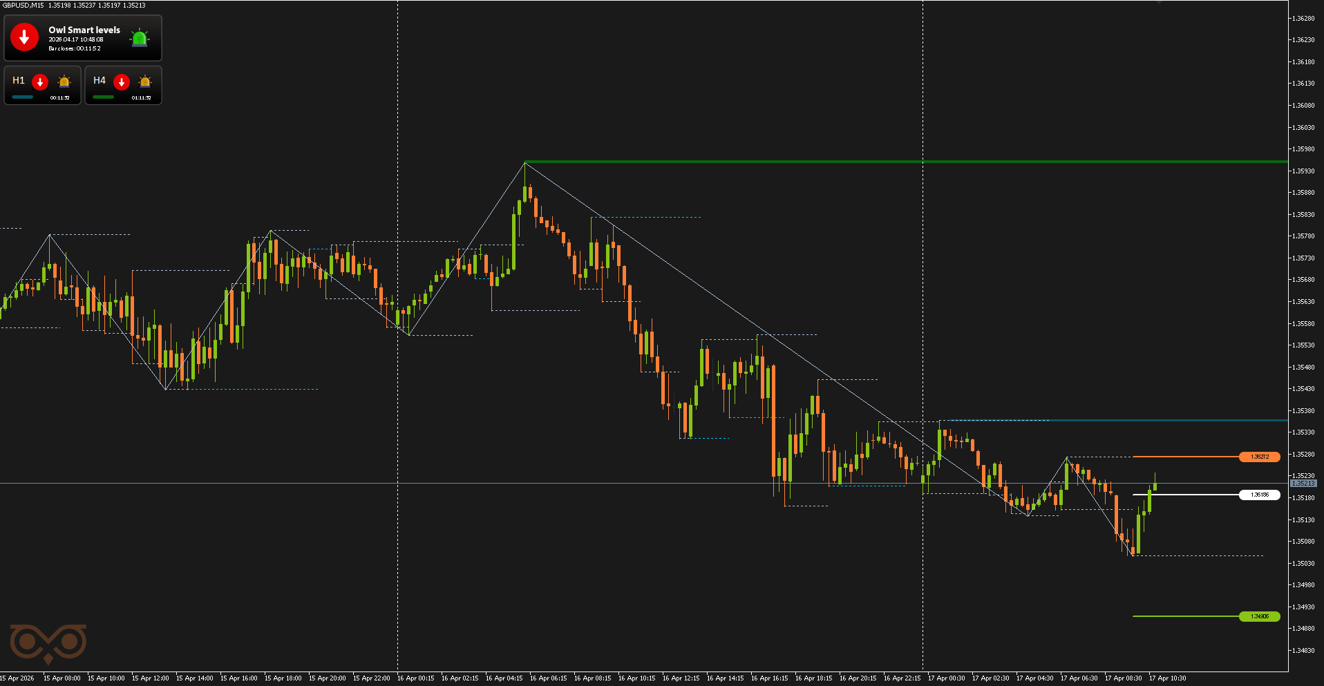 Третий сигнал по GBPUSD был получен 15 апреля и относился к категории высоковероятных. В данном случае точка входа была сформирована вблизи уровня H1, что усиливает сам сигнал и делает сценарий более рабочим по системе.