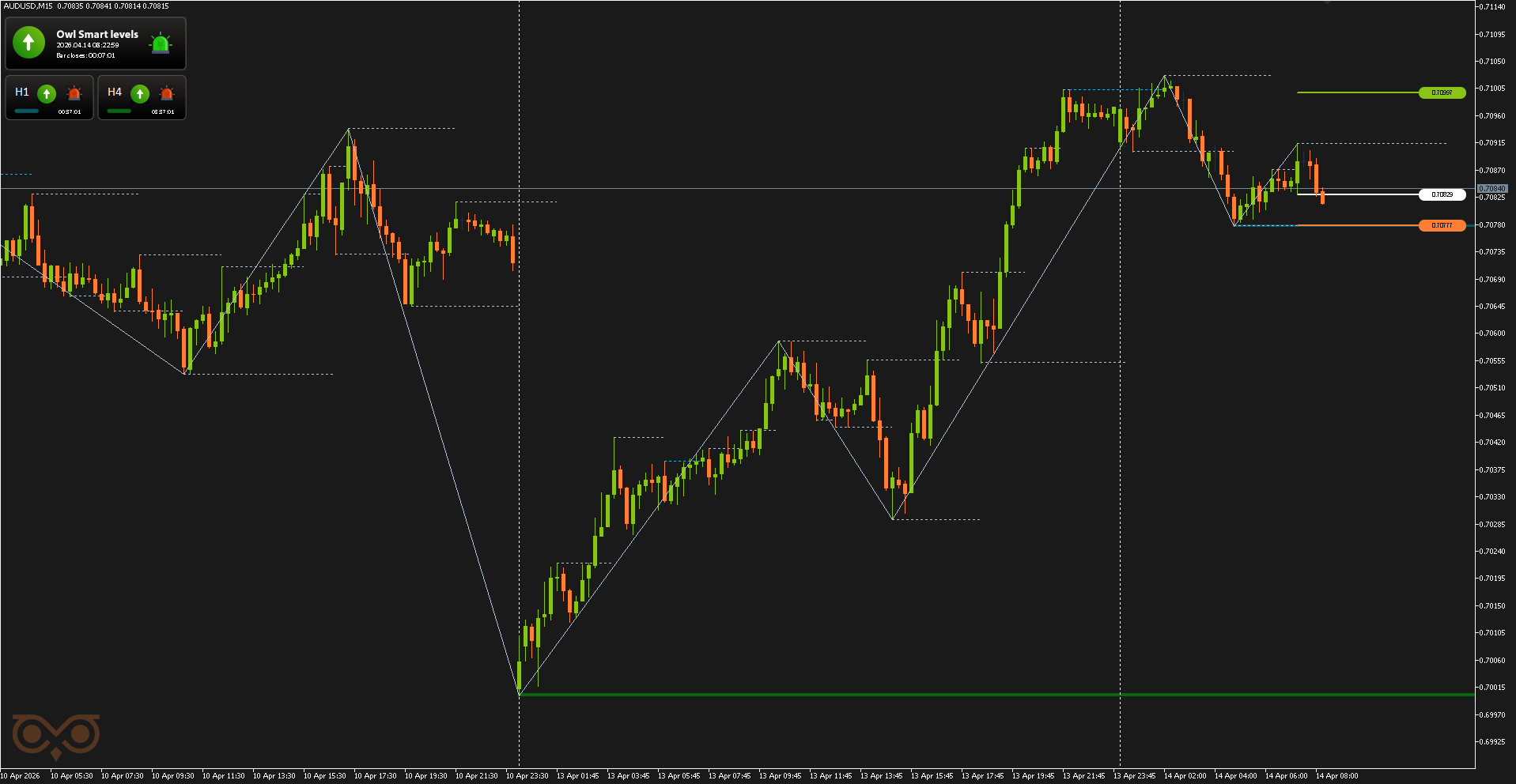 Второй сигнал по AUDUSD был получен также 14 апреля и относился к категории высоковероятных. В данном случае точка входа сформировалась вблизи уровня H1, что усиливает сам сигнал и делает сценарий более рабочим по системе.