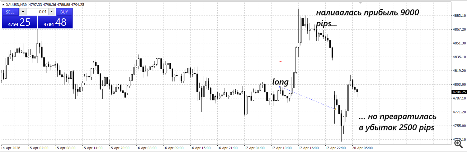Открыл long по золоту, налилась прибыль 9000 pips, но потом произошёл разворот и поползла цена вниз. Я переставил стоп на уровень прибыли 3400pips. Ночью понедельника цена гэпнула и стоплосс был проскочен, в итоге закрылась поза с убытком 2500 pips. В итоге просрано 11500 pips от депозита в общей сложности. Кошмар! А я ждал 5000 по золоту