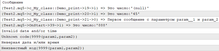 #include <Logger.mqh> //Пример использования class c_My_class { public: static void Demo_print() { LNG_PRINT(1);//код сообщения LNG_PRINT_1(1,45);//код сообщения и один параметр LNG_PRINT_2(0,"param__1","param_2");//код сообщения и два параметра } LNG_INIT }; //Указывается имя класса и используемые языки,максимум 4 //LNG_DEF_1,LNG_DEF_2,LNG_DEF_3,LNG_DEF_4 - последнее число указывает на количество языков //Сообщения.Для каждого класса свой набор сообщений LNG_DEF_2(c_My_class,lng_Russian,lng_English)//Указано имя класса и два используемых языка { {"Первое сообщение с параметром %s и %s","Pervoe soobchenie s paramenrom %s i %s"},//Русское и английское сообщение {"Это число:'%s'"},//Только русское }; void OnStart() { cLng::Set_is_skip_optimization(false);//При оптимизации будет логирование c_My_class::Demo_print(); LNG_CLASS_PRINT_1(c_My_class,1,888);//Использование сообщения из стороннего класса //LNG_CLASS_PRINT - без параметров //LNG_CLASS_PRINT_1 - 1 параметр //LNG_CLASS_PRINT_2 - 2 параметра cLng::Set_lng(lng_English);//Изменение языка на английский Print(cLng::Get_string(ERR_INVALID_DATETIME));//Получаем строку с ошибкой Print(cLng::Get_string(9999));//Тут не верный код ошибки cLng::Set_lng(lng_Russian);//Изменение языка на русский Print(cLng::Get_string(ERR_INVALID_DATETIME));//Получаем строку с ошибкой Print(cLng::Get_string(9999));//Тут не верный код ошибки }