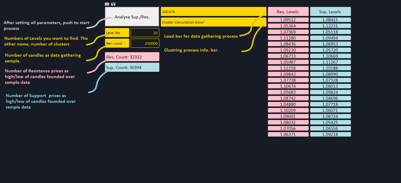 На основе этих правил (правила можно выбирать) был разработан индикатор, который собирает данные в две разные матрицы (sup_mat и res_mat). Количество уровней S/R, подчиняющихся выбранным правилам, отображается на экране во время сбора данных. Hense, библиотека AlgLib(dataanalysis.mqh) используется для кластеризации собранных данных методом K-means. Результаты отображаются в виде столбцов данных об уровнях поддержки и сопротивления.