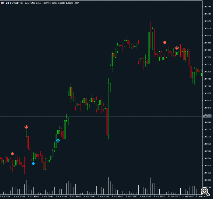 Простой сигнальный индикатор, основанный на RSI и скользящей средней. Показывает стрелки покупки/продажи, когда RSI выше/ниже 50 и цена выше/ниже MA.