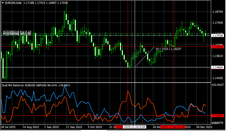 Dual MA Distance - индикатор показывает расхождение двух валютных пар. На фото показано два участка на индикаторе где он сильно разошёлся, вертикальная линия и вторая вертикальная линия где индикатор ушёл в противоположную сторону ниже синей линии. в данном примере показана пара EURUSD синим цветом и GBPUSD цвет красный на индикаторе. Как правило в данных парах фунт значительно опережает евро как при росте так при падении, на первом и втором фото можно увидеть расстояние которое прошли обе пары в пунктах, первая пара 143 пункта, вторая 284. Разницу почти в 140 пунктов можно было бы зафиксировать.