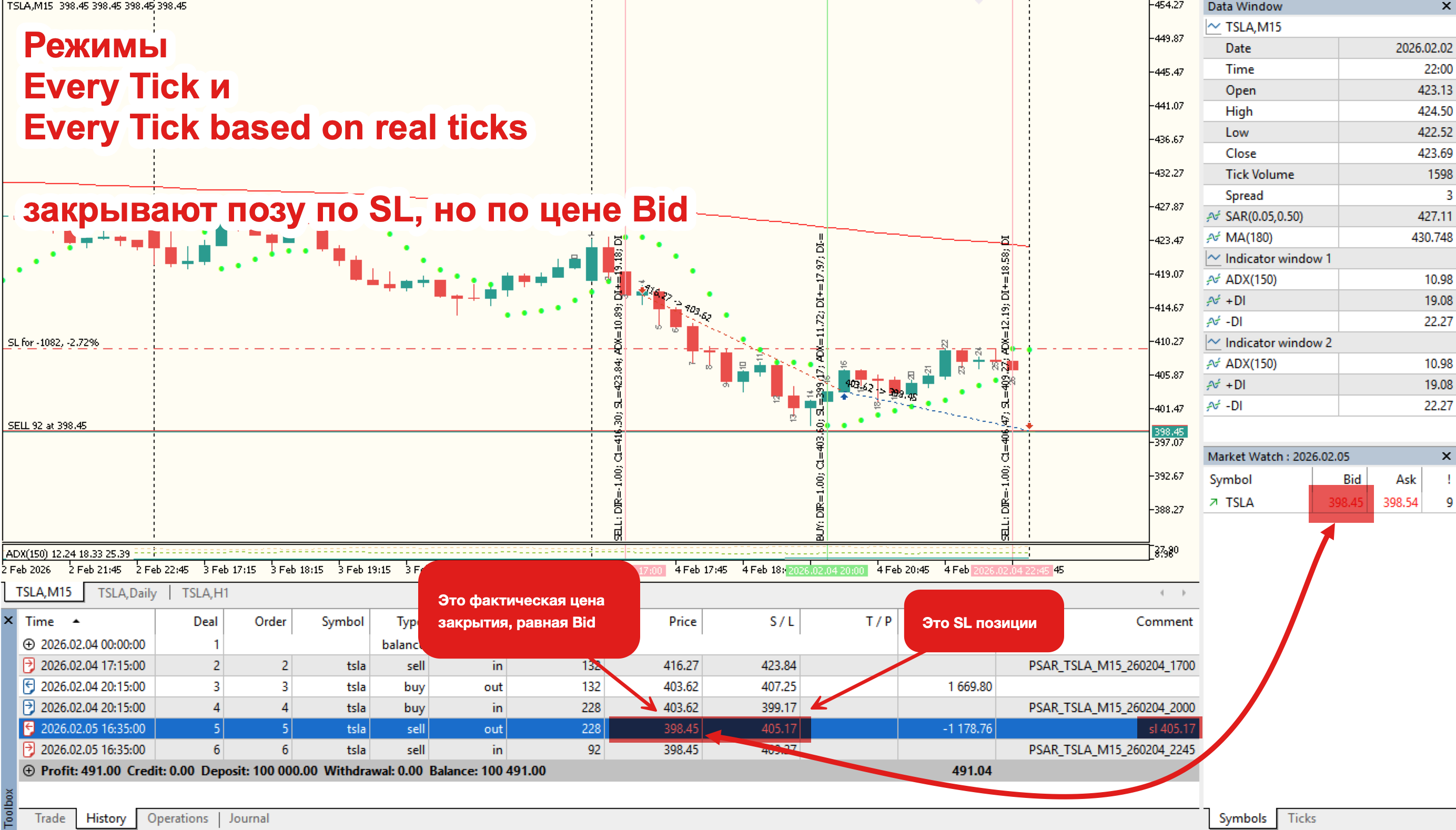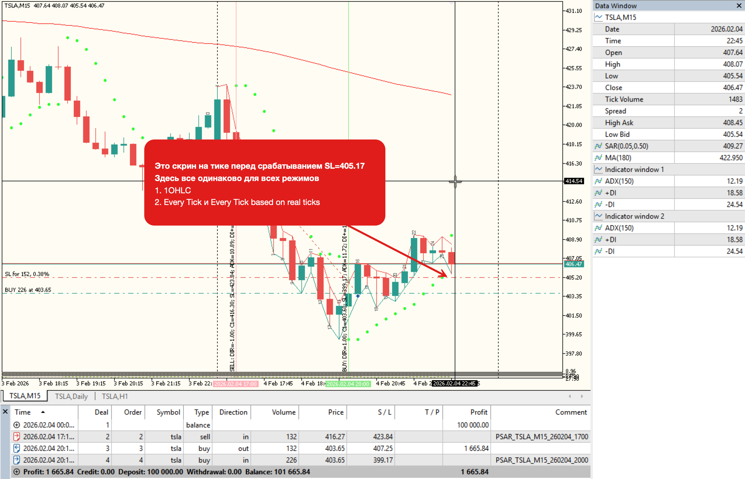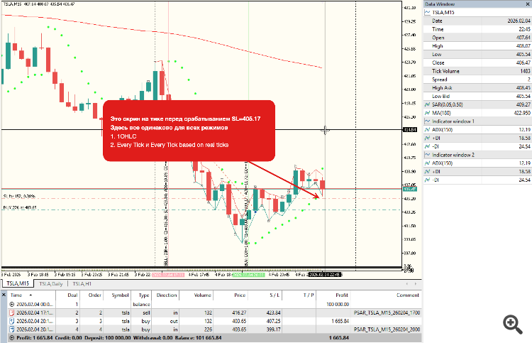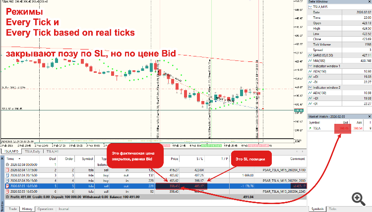 В моем конкретном примере все данные одинаковые на момент срабатывания SL как в OHLC, так и в Every tick. SL срабатывает на открытии новой свечи и за счет гэпа.При этом режимы "Every tick" берут Bid для DEAL_PRICE_OUT, а OHLC - сам SL. Хотя на первом "даже смоделированном" тике свечи в OHLC режиме у тестера есть ровно те же Ask/Bid, что и в Every tick режимах (скрины).