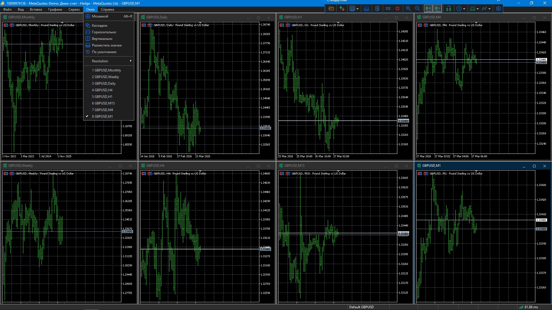 2) Ставлю во всех графиках профиля А таймфрейм от H1 до D1 включительно . Переключаюсь на другой профиль Б. После переключения на профиль А во всех графиках стоит М1.