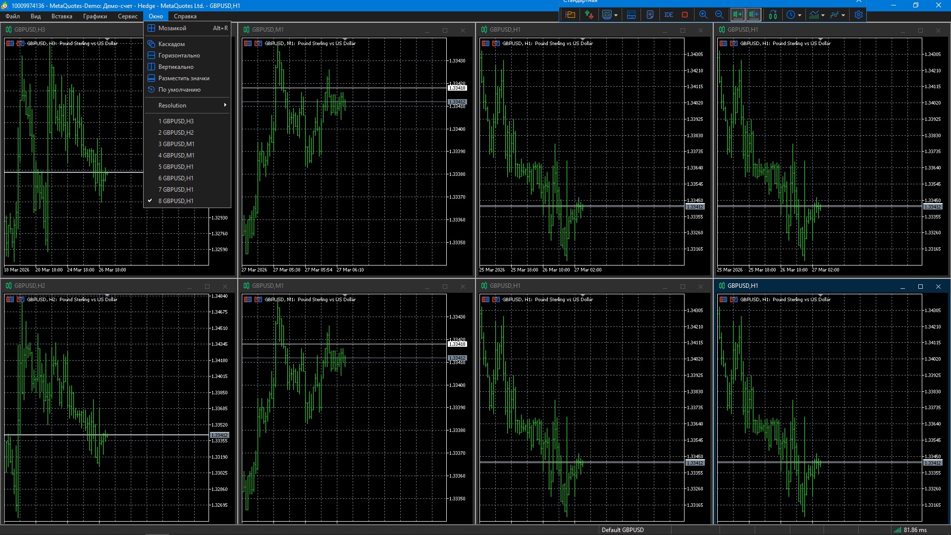 1) Ставлю во всех графиках профиля А таймфрейм от М1 до М30. Переключаюсь на другой профиль Б. После переключения на профиль А во всех графиках стоит H1.