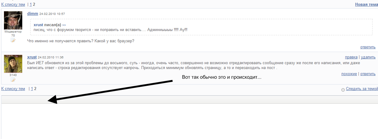 Был ИЕ7 обновился из за этой проблемы до восьмого, суть - иногда, очень часто, совершенно не возможно отредактироваать сообщение сразу же после его написания, или даже написать ответ - строка редактирования отсутствует напрочь. Приходиться минммум обновлять страницу, а то и перезаходить на пост .