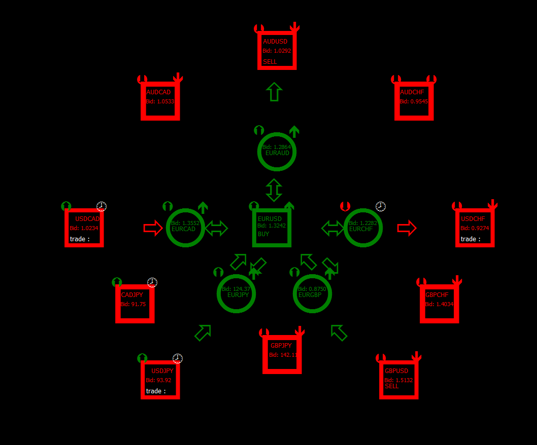 В двух словах как читать данную схему. Посредине установлена EURUSD, вокруг нее я выбрал наиболее торгуеумые валюты. Валюты в кружочках это так называемые буферные валюты, через которые идет переток в следующую валюту за ней. Если числитель или знаменатель одинаковый валют буферных и следующей за ней, то синхронный сигнал подтверждает движение и наоборот. Пример: EURCHF, USDCHF сигнал синхронный, падение для USDCHF - подтверждено. EURAUD дает сигнал на покупку, AUDUSD на продажу, сигнал на продажу AUDUSD — подтвержден. USDCAD- на продажу, EURCAD- на покупку , но у меня был синхронный сигнал.Поэтому пока что USDCAD — покупка, отменой покупки, будет синхронный сигнал на продажу. Таким образом картина рынка у нас предстает как на ладони и позволяет взять движение той валюты , потенциал в которой может быть максимальным.