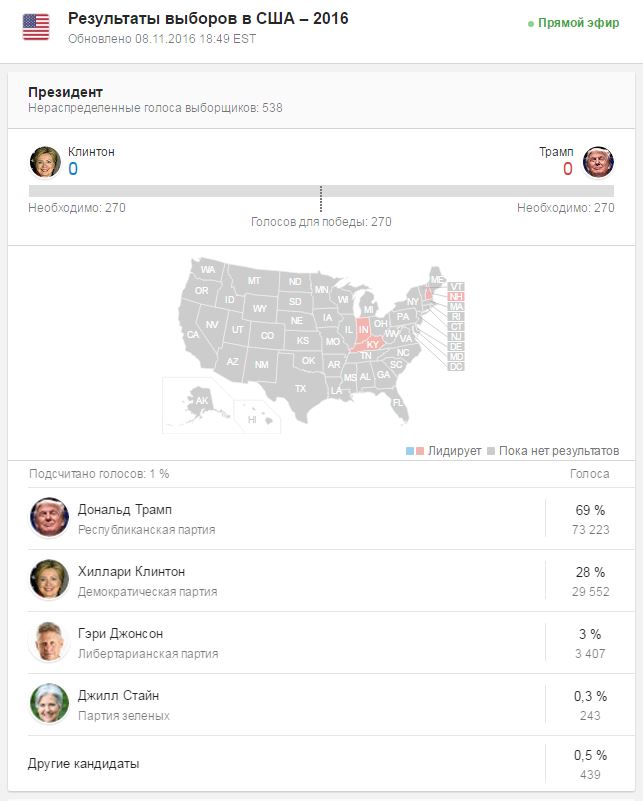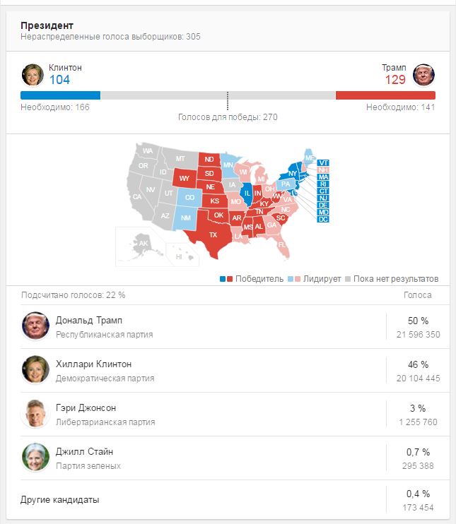 Да все бывает, само собой. Сейчас по ящику сказали, что на результаты может повлиять даже погода. За Клинтон голосуют большинство афров, латиносов и молодежь, если будет непогода, до 25% может не прийти голосовать. За Трампа люди среднего и пожилого возраста, если в южных штатах будет жара, тоже могут не пойти.