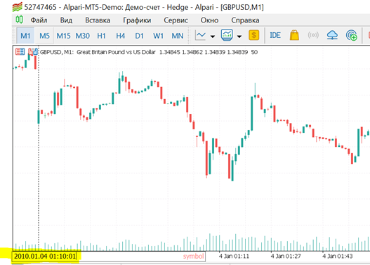 В режиме тестирования, при помощи желтого поля и клавиши ENTER с текущей даты на графике я попадаю в историю в 2010.01.04 01:10:01
