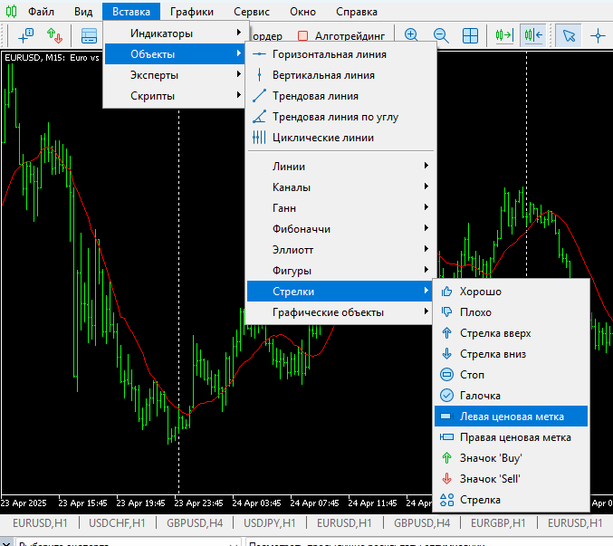 Увы, нужен значок стрелки, как в Тестере, когда от центра стрелки рисуется трендовый отрезок.