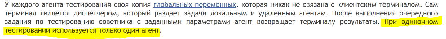 В статье ОСНОВЫ ТЕСТИРОВАНИЯ МТ5 написано что при одиночном тестировании используется только один агент. Как я понял один локальный агент из четырех , при четырехядерном процессоре . Как я понял НЕ одиночное тестирование - это ОПТИМИЗАЦИЯ советника.