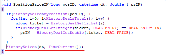 void PositionPriceIN(long posID, double & prIN) { if(HistorySelectByPosition(posID)) { for(int i=0; i<HistoryDealsTotal(); i++) { ulong ticket = HistoryDealGetTicket(i); if(HistoryDealGetInteger(ticket, DEAL_ENTRY) == DEAL_ENTRY_IN) prIN = HistoryDealGetDouble(ticket, DEAL_PRICE); } } HistorySelect(dt, TimeCurrent()); }