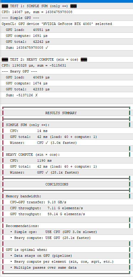 впечатляет конечно произодительность вычислений на GPU карте (NVIDIA GeForce RTX 3060) даже стоимостью ~300 USD в сравнении с CPU. Более чем в 1000 раз. 0.017 наносекунд на вычислительную итерацию sum += (long)(sin(x) * cos(x) * 1000.0f);
