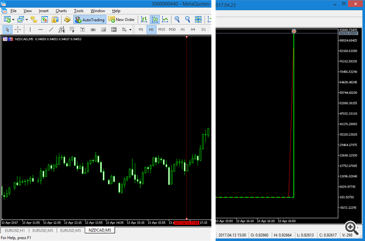 слева - NZDCAD, 13 апреля 2017. котировки в терминале на демке метаквотов
