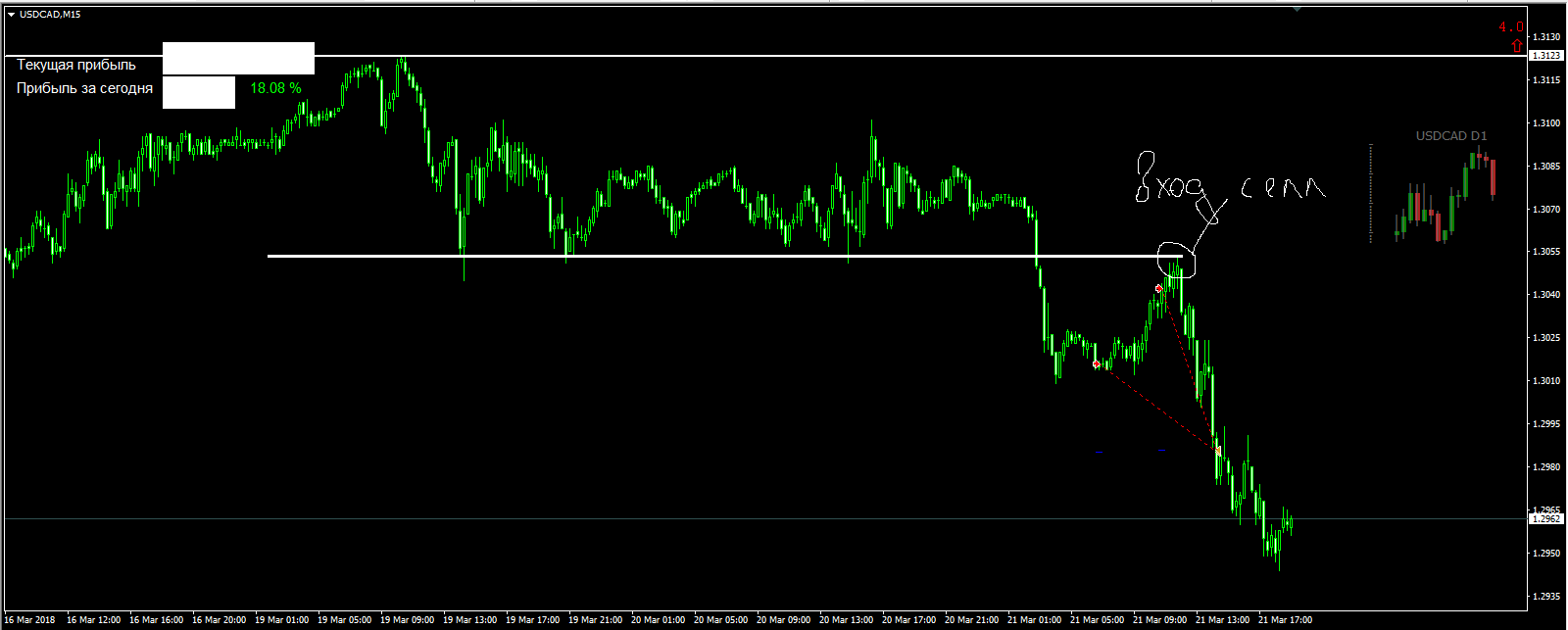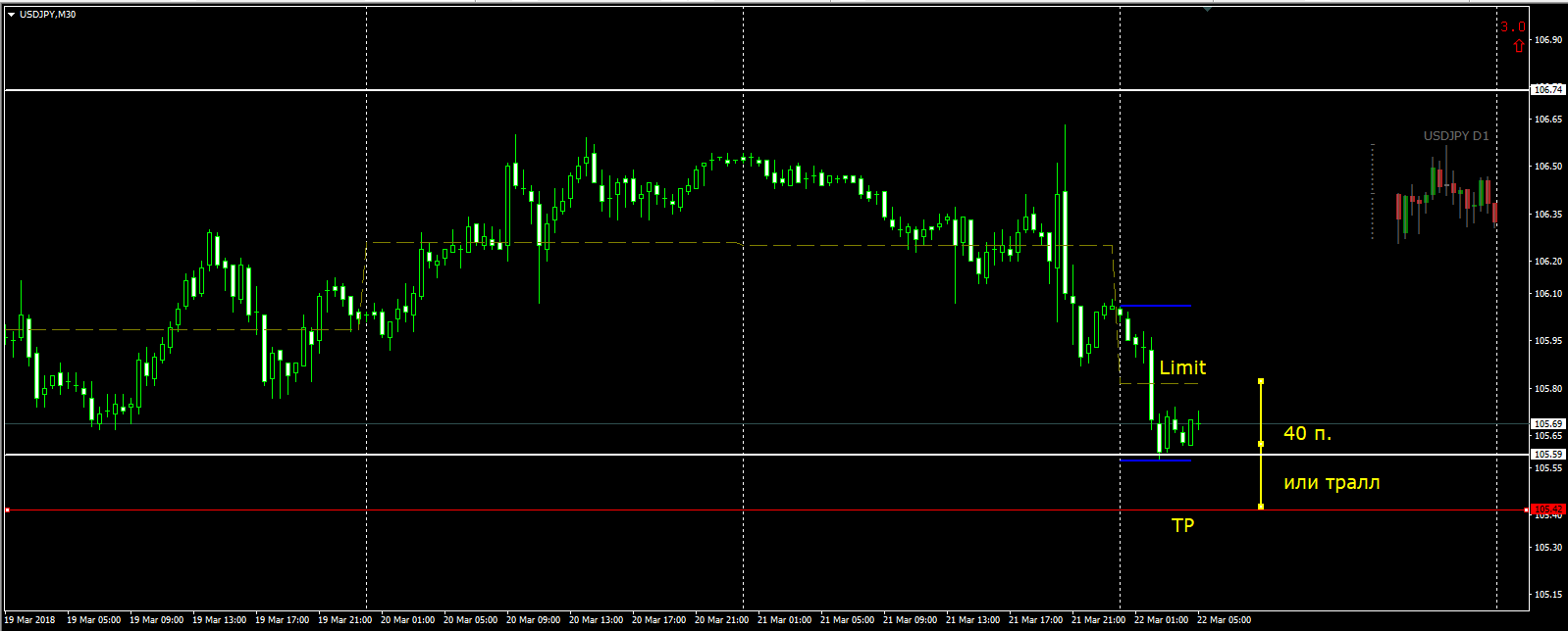 Вход от дневной средней, вход на пробой текущего лоу: