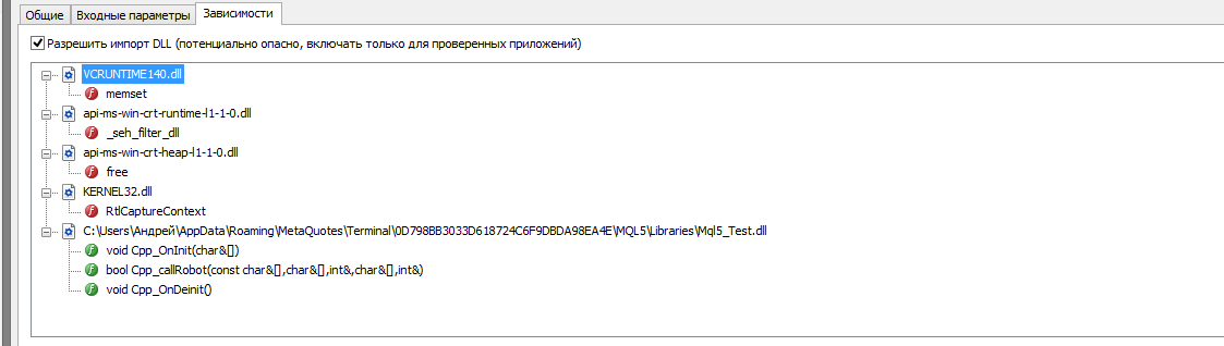 а в dll уже все перебираю и выделяю нужное. Довольно хорошо получилось, однако опять же вопрос по стыковке. Когда я пытаюсь подключиться к Dll из тестового скрипта, скрипт вылетает когда доходит до первой же функции (Cpp_OnInit).