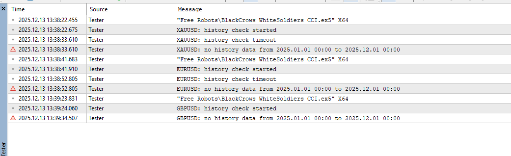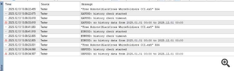 Привет! Ставлю в тестере тест любого робота, символа, ТФ, тип моделирования... Получаю ошибку: no history data. При этом в меню Symbols (Ctrl+U) данные всех ТФ (включая минутный) загружаются. В чем может быть дело и как это исправить?