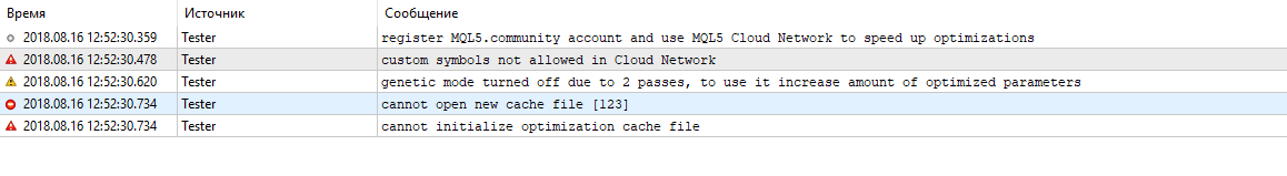 В тесте стоят 3 робота на трех терминалах. Специально ждал 0:00 что бы на истории от 16.08 потестировать изменения. Во всех терминалах тестер стратегий (без оптимизации) выдает ошибку.