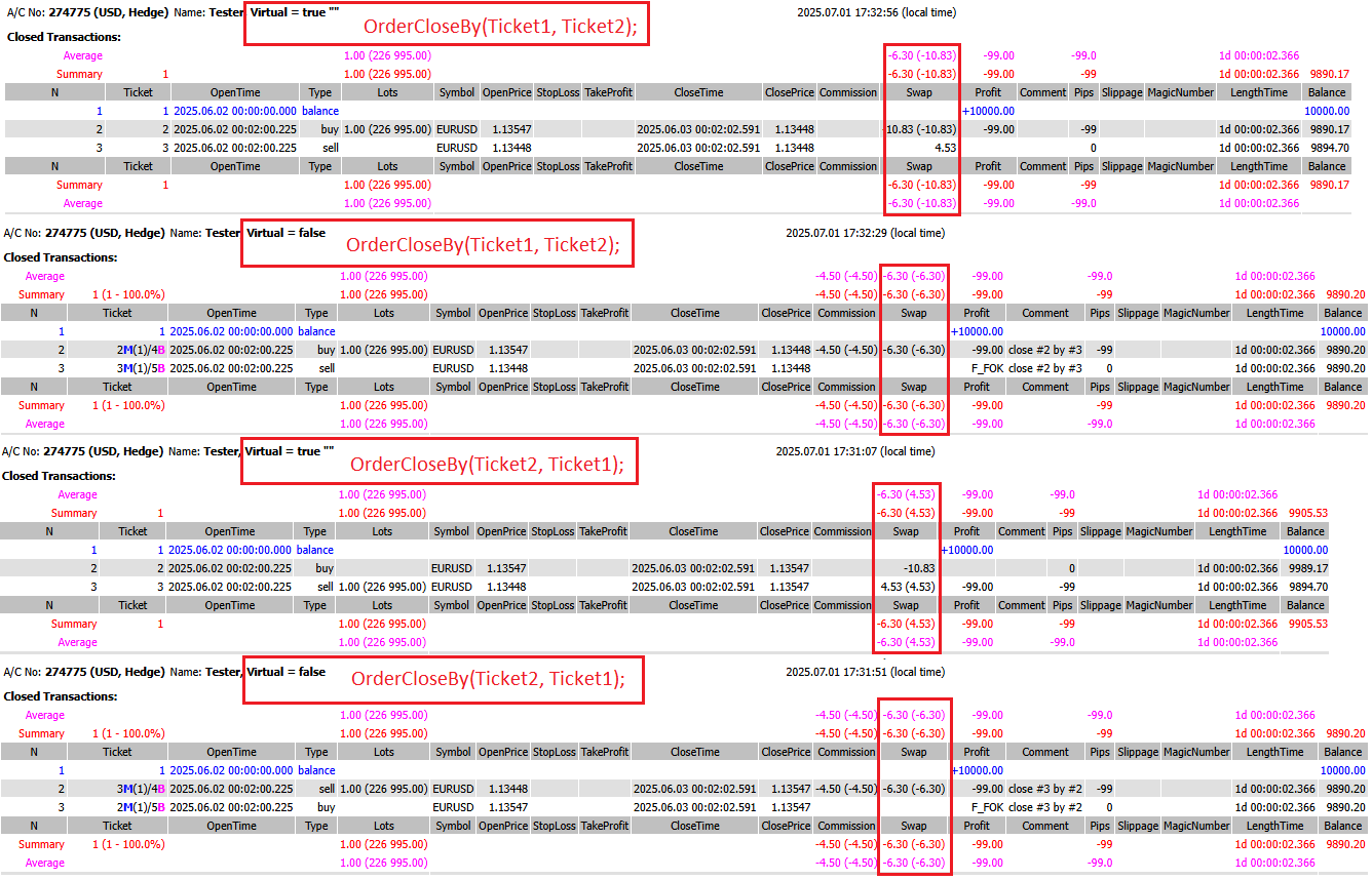 Есть некоторые отличия вычисления свопов для CloseBy-позиций в MT5-тестере и Virtual.