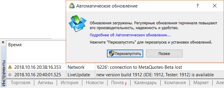 Загрузка обновлений приостанавливает торговлю, при том что само обновление приходит неожиданно